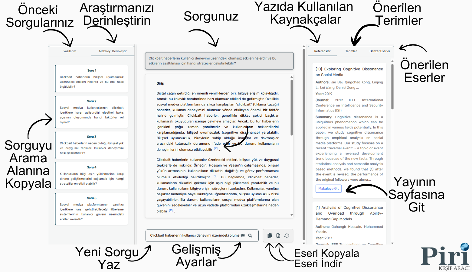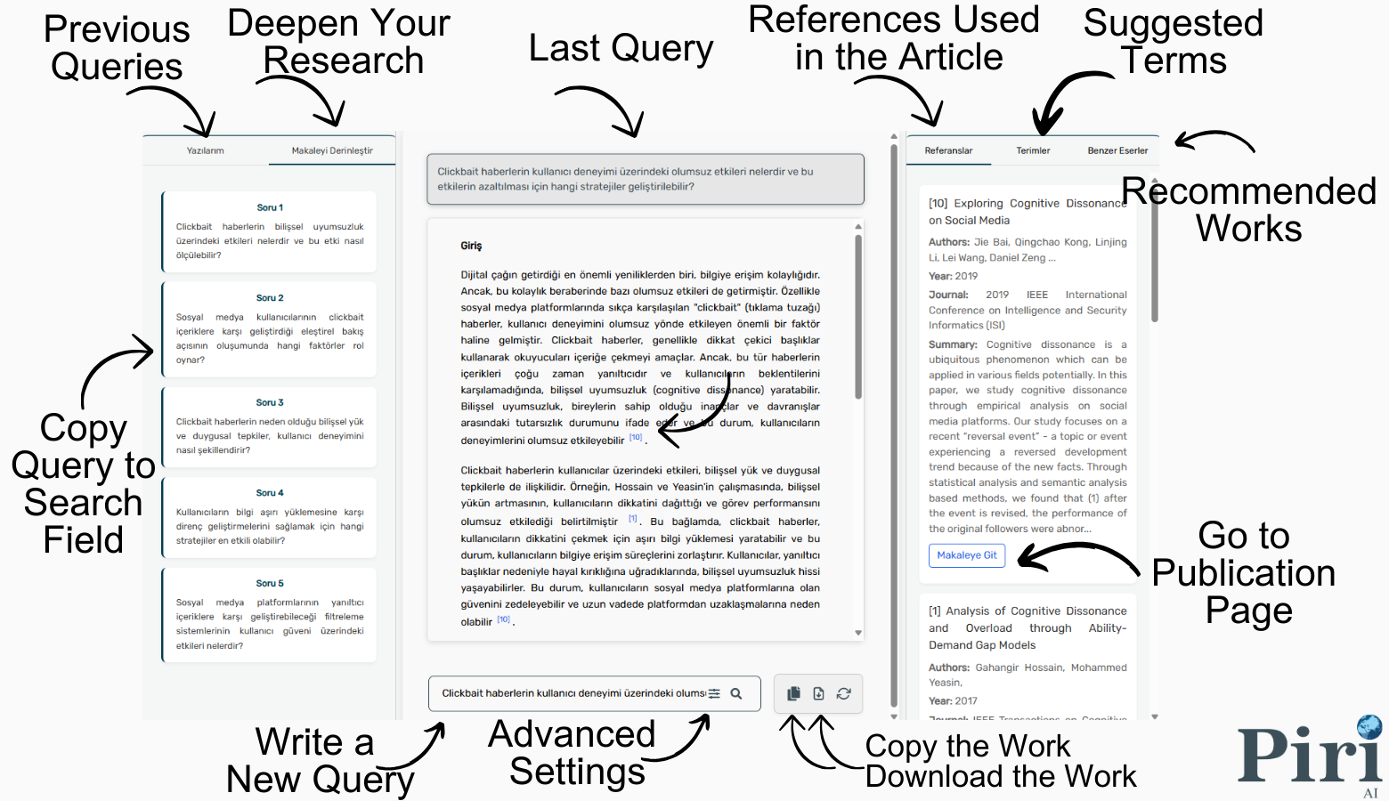 Piri AI, akademik araştırma ve yazım süreçlerini tamamen dönüştürebilecek bir yapay zekâ destekli içerik üretim aracıdır. Bu yenilikçi platform, zamanınızı verimli kullanarak yüksek kaliteli içerikler üretmenize yardımcı olur. Akıllı anahtar kelime üretimi, yayın tarama ve özetleme, otomatik atıf oluşturma gibi özelliklerle, araştırmalarınızı derinleştirirken iş yükünüzü hafifletir. Ayrıca, çoklu dil desteği ve geniş veri tabanı entegrasyonu sayesinde, dijital ve basılı kaynaklara zahmetsizce erişebilir ve araştırmalarınızı daha kapsamlı hale getirebilirsiniz. Piri AI ile saniyeler içinde akademik standartlara uygun, tamamen akademik kaynaklar kullanılan içerikler hazırlayabilir, fikirlerinizi etkili bir şekilde ifade edebilirsiniz. Kullanıcı dostu arayüzü ve esnek düzenleme seçenekleri sayesinde, yazım sürecinizi tamamen kontrol edebilirsiniz. Araştırmalarınızda fark yaratmak ve çalışmalarınızı bir üst seviyeye taşımak için Piri AI’yı şimdi deneyin ve akademik hedeflerinize daha hızlı ulaşabilirsiniz.